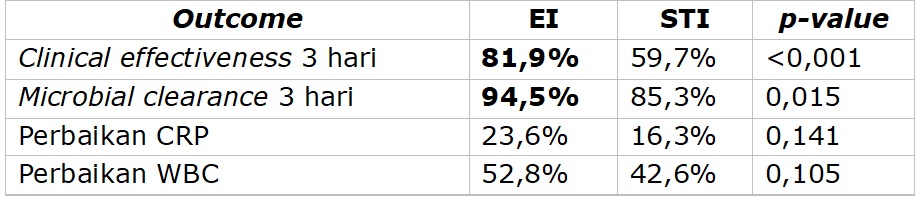Outcome primer: Efektivitas klinis 3 hari dan microbial clearance 3 hari. Outcome sekunder: Perbaikan CRP dan sel darah putih 3 hari dengan analisis faktor keamanan dengan abnormalitas BUN (blood urea nitrogen), kreatinin, dan ALT dalam 3 hari.