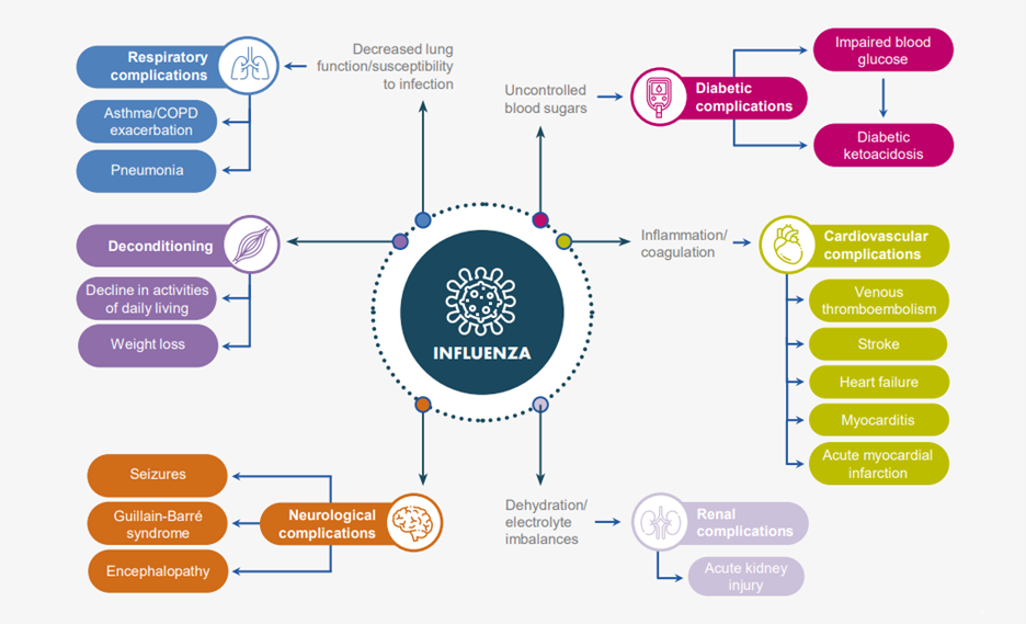 Influenza dapat menyebabkan masalah kardiovaskular seperti gagal jantung, tromboemboli vena, dan miokarditis; efek neurologis seperti kejang, ensefalopati, dan sindrom Guillain-Barré; serta gangguan metabolisme termasuk glukosa darah yang tidak terkontrol dan ketoasidosis diabetik. Infeksi bakteri sekunder yang parah, terutama pneumonia yang disebabkan oleh Streptococcus pneumoniae, juga sering terjadi. Orang dewasa yang lebih tua sangat berisiko, dengan 15% dari mereka yang berusia 65 tahun atau lebih kehilangan kemandirian dalam kehidupan sehari-hari setelah dirawat di rumah sakit.