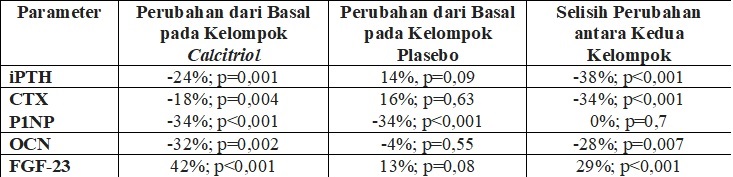 Hasilnya menunjukkan bahwa terapi calcitriol selama 48 minggu menyebabkan penurunan yang signifikan pada kadar iPTH, CTX, P1NP, dan OCN, serta peningkatan yang signifikan pada FGF-23. Tidak ada perubahan pada kelompok plasebo pada petanda turnover tulang, kecuali untuk penurunan P1NP.