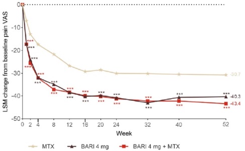 Baricitinib monoterapi 1 x 4 mg lebih efektif dari methotrexate monoterapi 1 x per minggu untuk meredakan gejala nyeri (VAS), secara bermakna (p<0,001), pada pasien rheumatoid arthritis.