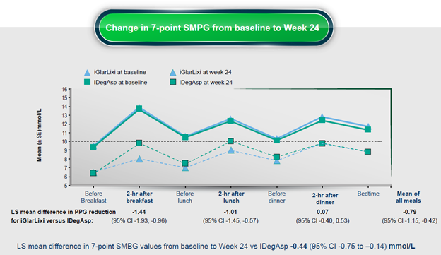 5. Frias JP, Dex T, Meneghini L, Amelie R, Shah V. Effect of IGlarLixi on continuous glucose monitoring-measured time in range in insulin-naïve adults with suboptimally controlled type 2 diabetes (A1C ≥11.7–18.1 mmol/L/9–13%) Presented at ATTD 2024. Oral Presentation #02