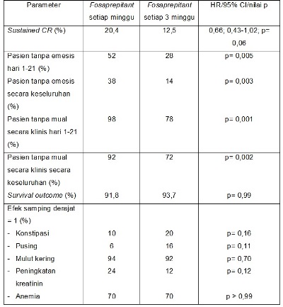 Dari studi ini tidak terdapat perbedaan bermakna dalam hal respons komplit sustained, namun pasien yang mendapat fosaprepitant weekly kurang mengalami emesis (muntah) dibandingkan pasien yang mendapat fosaprepitant 3-weekly. Fosaprepitant weekly dapat ditoleransi pasien dan memperbaiki kualitas hidup tanpa mempengaruhi survival.