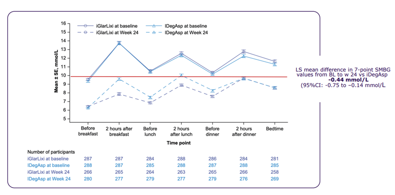 - iGlarLixi non inferior dan superior dalam pengurangan HbA1c dibandingkan dengan IDegAsp, dengan pengurangan sebesar -1,88 dari baseline.
