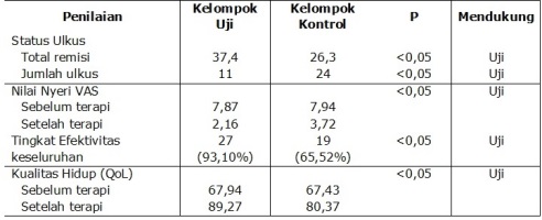 Hasil penelitian menunjukkan bahwa terdapat peningkatan yang signifikan pada status ulkus, skor nyeri VAS, tingkat efektivitas keseluruhan, dan kualitas hidup pada kelompok uji (p < 0,05).