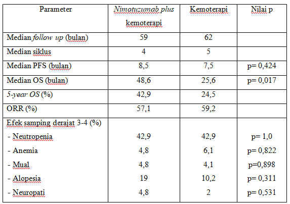 Analisis univariate menunjukkan bahwa modalitas terapi berkaitan secara bermakna dengan overall survival (OS). Tidak terdapat perbedaan yang bermakna dalam hal toksisitas pada kedua kelompok terapi. Tidak terpantau ruam kulit atau mukositis dengan nimotuzumab.