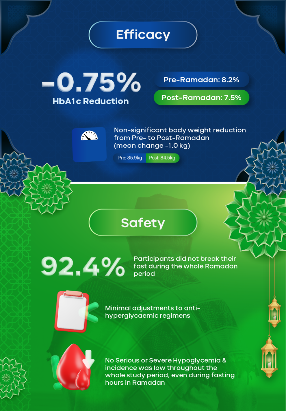 Selain profil keamanan, studi SoliRam juga menunjukkan efikasi yang baik pada pasien DMT2 yang menjalankan ibadah puasa. Terjadi penurunan rerata HbA1c sebesar 0,75%, dari 8,2% pada periode pra-Ramadan menjadi 7,5% pada periode pasca-Ramadan. Selain itu, pasien yang mendapatkan iGlarLixi juga menunjukkan rerata berat badan yang stabil selama masa studi, dimana terjadi penurunan rerata berat badan yang tidak signifikan sebanyak 1,0 kg [pre-Ramadan (85.9 kg), post-Ramadan (84.5 kg)].