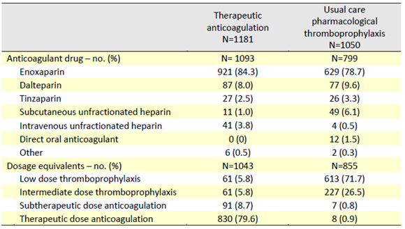 Sebuah uji coba label terbuka, adaptif, multiplatform, terkontrol, mempelajari perbandingan penggunaan rejimen antikoagulan dosis terapeutik dengan heparin (lihat Tabel) atau tromboprofilaksis farmakologis perawatan biasa pada pasien yang dirawat di rumah sakit dengan COVID-19 dan yang sakit non-kritis (didefinisikan sebagai tidak adanya dukungan organ tingkat perawatan kritis pada saat pendaftaran uji coba).