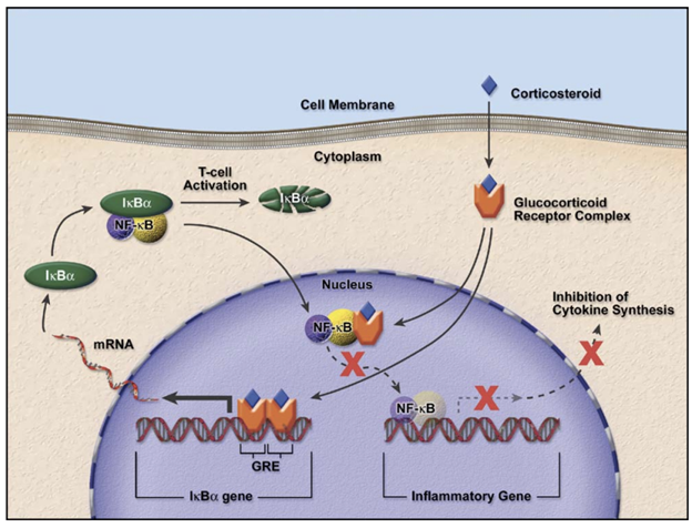Kortikosteroid bersifat lipofilik dan mudah melintasi membran sel untuk berikatan dengan reseptor kortikoid dan membentuk dimer, yang kemudian berpindah ke dalam nukleus dari sel dan menghasilkan efek terapeutik dengan meregulasi ekspresi gen.4 Kortikosteroid bekerja melalui dua jalan yang berbeda. Pada tingkat seluler, melalui jalur genomik dan non-genomik. Yang dimaksud dengan jalur genomik adalah melalui reseptor glukokortikoid dan aktivasi kortisol, diikuti dengan homodimerisasi dari reseptor, dan berikatan dengan elemen yang responsif pada glukokortikoid atau glucocorticoid responsive elements (GREs).4 Kortikosteroid berikatan dengan reseptor kortikosteroid dalam sitoplasma dan membentuk kompleks steroid-reseptor yang kemudian bertanslokasi ke dalam nukleus. Di dalam nukleus, kompleks steroid-reseptor ini berikatan sebagai homodimer dari GRE pada gen target yang responsif akan kortikosteroid untuk dapat menstimulasi atau menghambat transkripsi dan sintesis protein.2