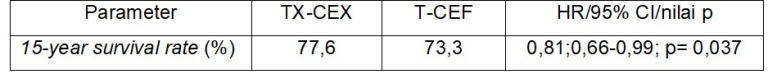 Dalam analisis subgrup, pasien dengan reseptor estrogen negatif dan tripel negatif (15-year survival rate 74,5% vs 64,2%; HR 0,59; 95% CI 0,36-0,97; p= 0,051) yang mendapat TX-CEX cenderung memiliki harapan hidup lebih panjang dibandingkan T-CEF.