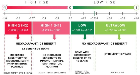 Uji klinik I-SPY2 menunjukkan bahwa terdapat perbaikan pCR yang terpantau jika penghambat immune checkpoint (imunoterapi) diberikan sebagai komponen dalam kemoterapi neoadjuvan pada pasien kanker payudara stadium dini HR+, HER2- dengan tumor MammaPrint (MP) High 2. Studi FLEX merupakan studi prospektif real-world yang dilakukan pada pasien kanker payudara stadium I-III yang dilakukan pemeriksaan MammaPrint. Dalam studi ini, sejumlah 79% tumor adalah MP High 1 dan 21% adalah MP High 2. Pasien dengan tumor MP High 2 cenderung berusia lebih muda dan ditemukan tumor derajat 3. Selain itu, tumor MP High 2 dengan ER% staining >10% ditemukan sebesar 83,2%.