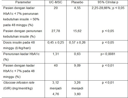 Tidak terdapat perbaikan dalam fungsi sel beta islet pada kedua kelompok. Tidak dijumpai efek samping mayor terkait transplantasi UC-MSC. Secara keseluruhan, 13,5% pasien menjadi bebas dari insulin pada 8-24 minggu setelah transplantasi UC-MSC dan tetap bebas insulin tanpa penggunaan kembali selama 37,2 ± 15,2 minggu. Tidak terdapat pasien pada kelompok plasebo yang bebas insulin.