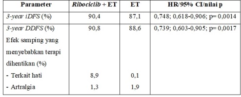 Follow up masih berlangsung untuk overall survival (OS), tetapi terdapat kecenderungan perbaikan OS pada kelompok RIB + ET (p= 0,0563). Ribociclib 400 mg memiliki profil keamanan favorable tanpa sinyal keamanan yang baru.