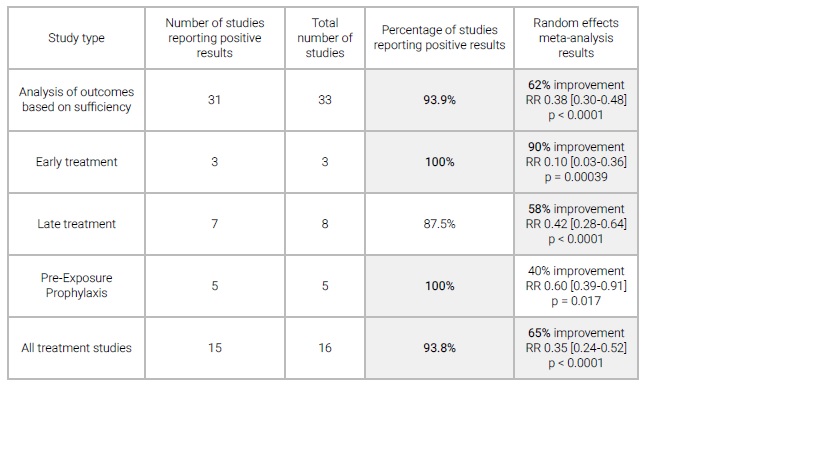Hasil dari meta-analisis (total 49 studi) menunjukkan bahwa vitamin D efektif untuk pasien Covid-19. Kadar vitamin D yang cukup dikaitkan dengan penurunan risiko (terinfeksi, hospitalisasi, progresivitas, dan kematian) sebesar 62% (dari 33 studi), dan terapi vitamin D (dari 16 studi) dikaitkan dengan penurunan risiko (progresivitas, kematian) sebesar 65%.