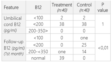 Studi oleh TufekciS, et al, yang dilakukan dengan metode acak, terkontrol plasebo, pada 80 bayi baru lahir (usia 24 jam) dengan defisiensi vitamin B12 (<200 pg/mL) dan usia gestasi sekitar 34-42 minggu. Kelompok terapi (n: 40 pasien) diberikan 500 mcg/hari oral mecobalamin. Kelompok kontrol (n: 40 pasien) tidak diberikan apa-apa. Terapi ini berlangsung selama 1 bulan dan difollow-up sebelum dan sesudah terapi, dengan mengukur kadar vitamin B12 melalui tali pusar sebelum terapi dan kadar vitamin B12 plasma darah setelah terapi. Hasil studi tampak di bawah ini.1
