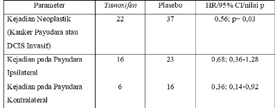 Setelah median follow up selama 5,1 tahun, didapatkan kejadian neoplastik sebesar 14 pada kelompok tamoxifen dan 28 pada kelompok plasebo (HR 0,48; 95% CI 0,26-0,92; p= 0,02). Tamoxifen menurunkan kejadian pada payudara kontralateral sebesar 75% (3 kejadian vs 12 kejadian; HR 0,25; 95% CI 0,07-0,88; p= 0,02). Tidak terdapat perbedaan dalam hal outcome yang dilaporkan pasien kecuali sedikit peningkatan hot flashes dengan tamoxifen (p= 0,02). Satu kejadian trombosis vena dalam dan 1 kanker endometrium stadium I dijumpai pada kelompok tamoxifen dan 1 kejadian emboli paru dijumpai pada kelompok plasebo.