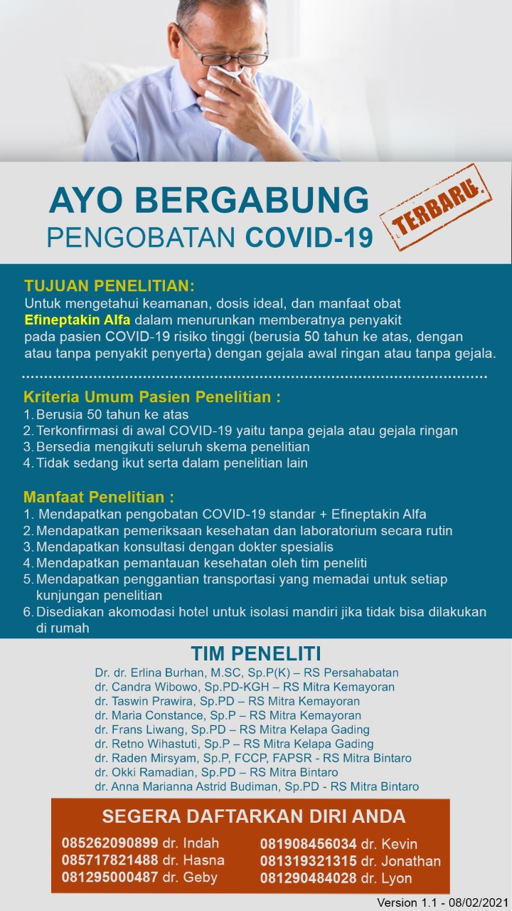 PT Kalbe Genexine Biologic saat ini sedang melakukan penelitian obat Efineptakin Alfa pada pasien COVID-19 berusia 50 tahun ke atas, dengan kriteria pasien tanpa gejala atau gejala ringan. Efineptakin Alfa adalah obat baru yang sedang melalui uji klinik untuk mengevaluasi manfaatnya dalam meningkatkan jumlah sel limfosit serta mencegah memberatnya gejala pada pada pasien COVID-19. Bagi yang berminat dan ingin mengetahui lebih lanjut berikut informasi lengkapnya.