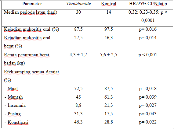Hasil lainnya adalah thalidomide menurunkan nyeri pada mulut dan tenggorok serta intensitasnya pada pasien selama kemoradioterapi konkuren (p= 0,026). Evaluasi efikasi jangka pendek setelah menyelesaikan kemoradioterapi konkuren menunjukkan ORR 96,3% dan 93,8% (p= 0,717) pada kelompok thalidomide dan kontrol.